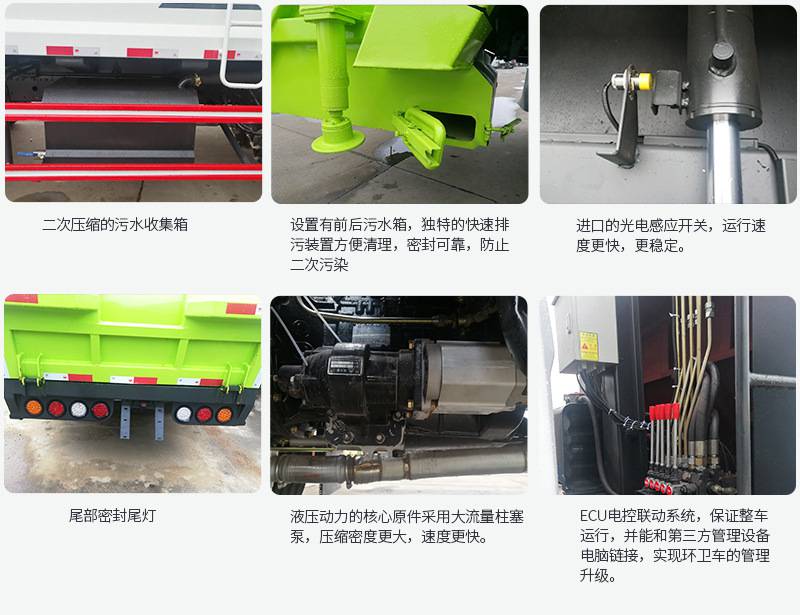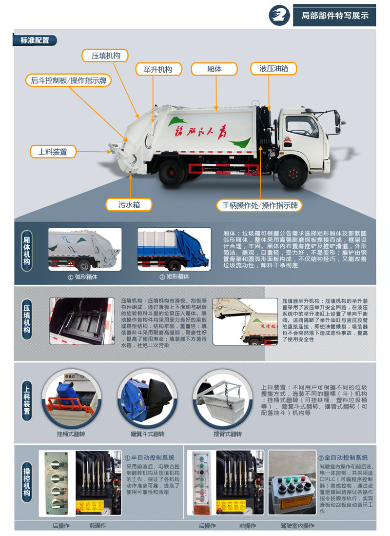 上裝配置:廂體圓弧設(shè)計(jì)(增強(qiáng)廂體承受力),Q345錳鋼板(高強(qiáng)度耐磨抗壓材質(zhì),罐體試用壽命更長),前后雙向壓縮,推鏟卸料,長源液壓泵,中梅多路換向閥,維森博樂油缸,高耐壓液壓油管,西門子PLC一鍵操作系統(tǒng)(駕駛室內(nèi)外均可操作),移動遙控器控制箱體操作,雙污水箱(前后各一個),邊燈,高位示廓燈,夜間作業(yè)燈。